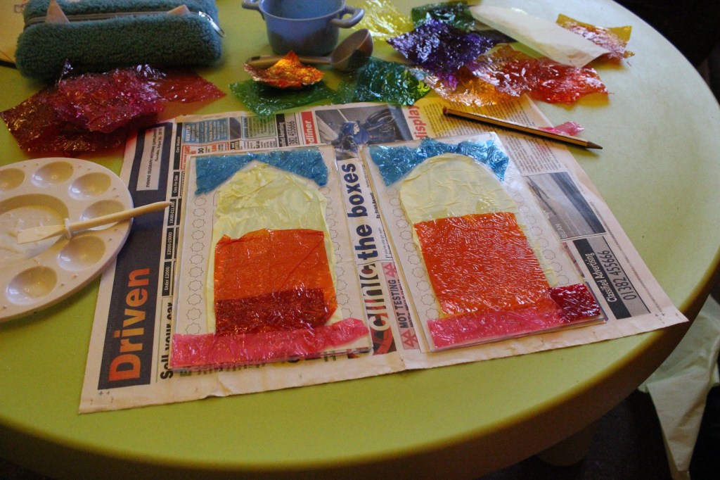 IMG_8746 I then made up my stained glass panels using coloured cellophane sweet wrappers, tissue paper and PVA glue.s