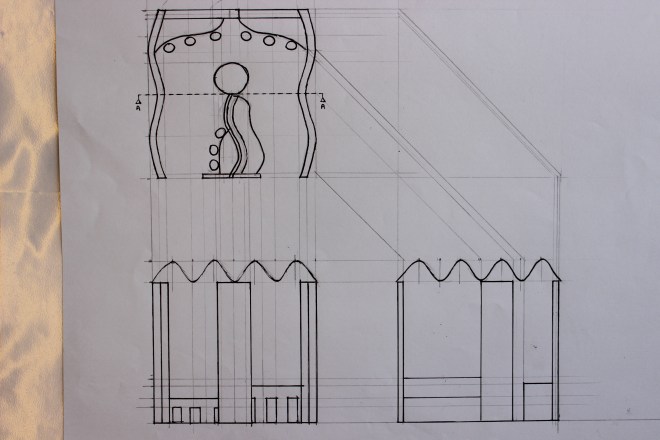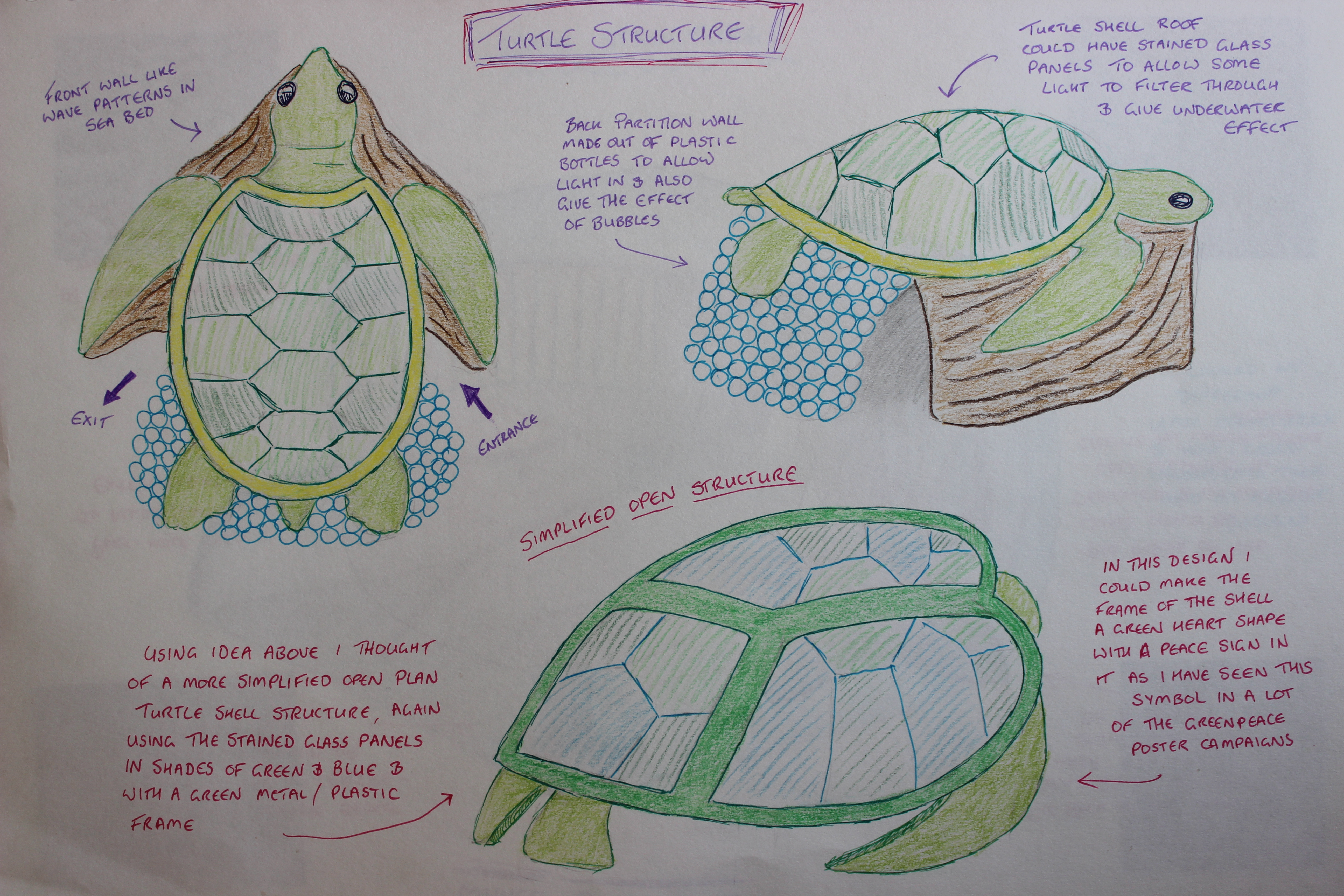 In the end I decided to go with wave structures on the outer walls and the underwater theme in the interior. A partition wall would go up the middle creating a walkway which you would have to walk round. My design would also include computers along the back wall, an interactive children’s play area, a plastic bottle partition wall and hanging sea creature sculptures made out of recycled materials.