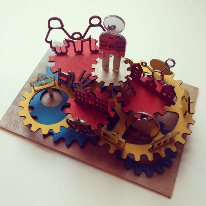 For the first part of my research I explored child development and psychology. Early childhood experiences can have a lasting impact on their development; I discovered that significant stresses in the caregiving environment can have lifetime consequences. My research led me on to the pioneering work of Maria Montessori who’s methods include allowing children to make creative choices in their own learning; working in groups and individually to develop their maximum potential. I also looked into the work of Loris Malaguzzi, who developed the Reggio Emilia approach, a child-centred early educational philosophy that states; ‘children are powerful and capable individuals, with the ability and desire to construct their own knowledge.’I looked into Bronfenbrenner’s Ecological Systems Theory which explains how the fundamental qualities of children and their environments can interact and influence how they develop. While little can be done about the greater macrosystem, small changes giving a child a step up near the centre of the machine can make a huge difference to their overall lives. I used this system to base my emotive model on but equating it to different cogs and gears turning in a machine and in turn influencing each other. All of these different factors that can contribute to how a child thrives in the environment in which they are in.