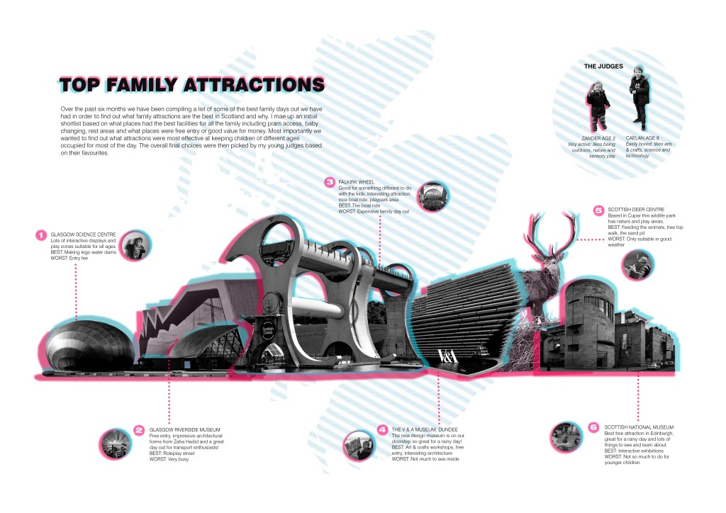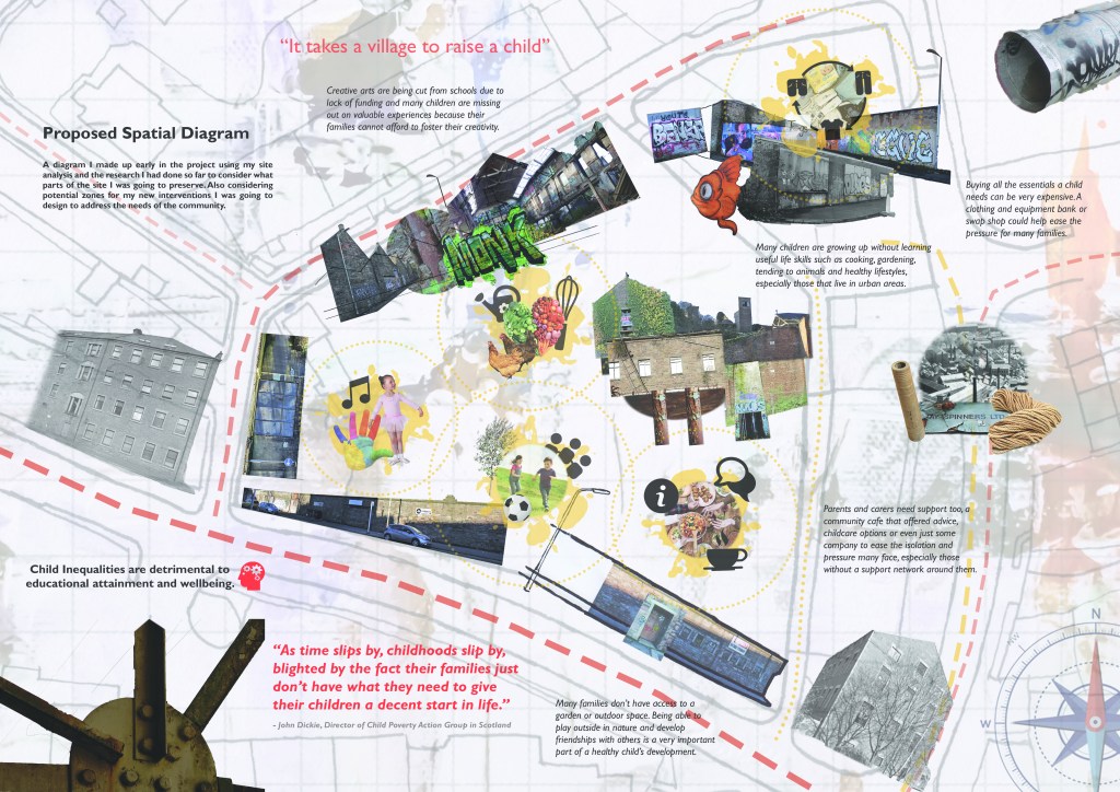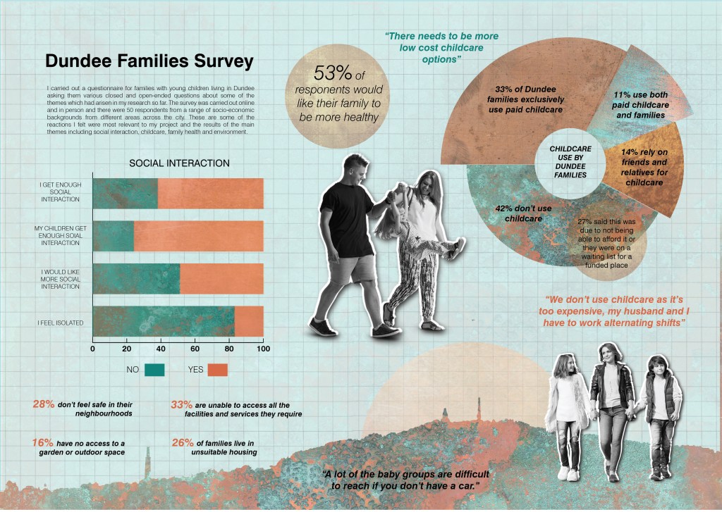 For the rest of my research I investigated with my own family which local attractions are the best and why and made up an infographic with the results. I also conducted a survey online and in person to families across Dundee to determine what needs there were locally in the city. The main themes that had arisen during my research were social interaction, lack of affordable childcare, family health and the how families rated their immediate environments. I then combined this with my earlier site analysis and made up a spatial diagram zoning out what areas I could put in place to try to address some of these needs.